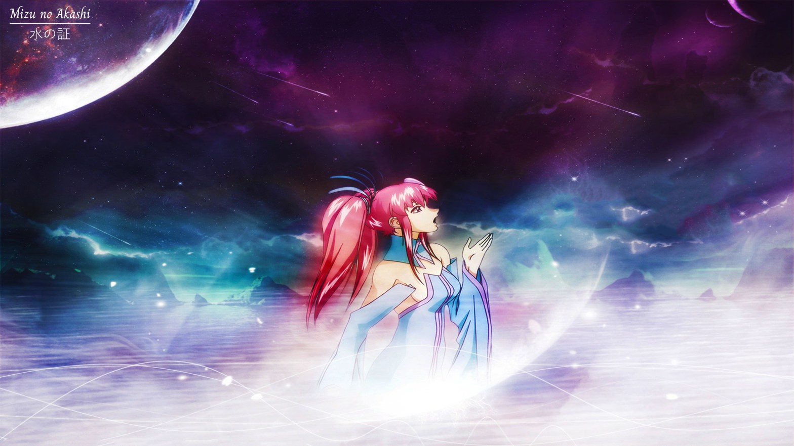 水の中に夜が揺れてる 悲しいほど静かに佇む 緑なす岸辺 美しい夜明けを ただ待っていられたら きれいな心で 暗い海と空の向こうに 争いのない場所があるのと 教えてくれたのは誰 誰もが辿り着けない それとも誰かの心の中に 水の流れを静めて くれる大地を潤す調べ 今はどこにもなくても きっと自分で手にいれるの いつも、いつか、きっと 水の証をこの手に 全ての炎を飲込んでなお 広く優しく流れる その静けさに辿り着くの いつも、いつか、きっと あなたの手を取り……